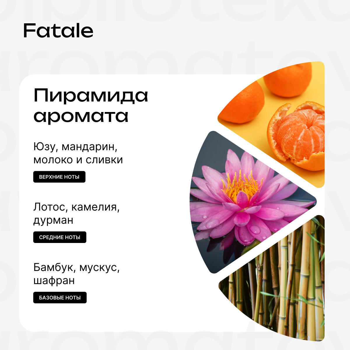 Композиция аромата Fatale вобрала в себя одни из лучших компонентов: цитрусовые ноты спелого танжерина, цветки груши, горько-свежий юзу, взбитые сливки, лепестки цветов и глубокий микс мускуса и шафрана. Романтичная фантазия о букете цветов в вазе, наполненной розовыми кубиками льда.