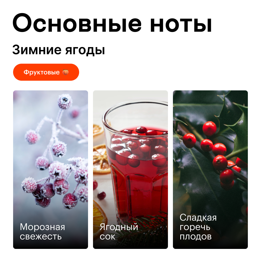 Свежий и яркий аромат, который воплощает всю магию зимних ягод. Здесь сплетаются и вьюжат ноты сочных красных плодов и трескучих морозов. Идеально подходит для тех, кто хочет окунуться в атмосферу зимнего волшебства и чувствовать себя особенным.